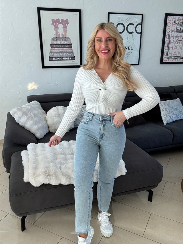 Stretch MOM Jeans BASIC light denim blue kaputter Saum