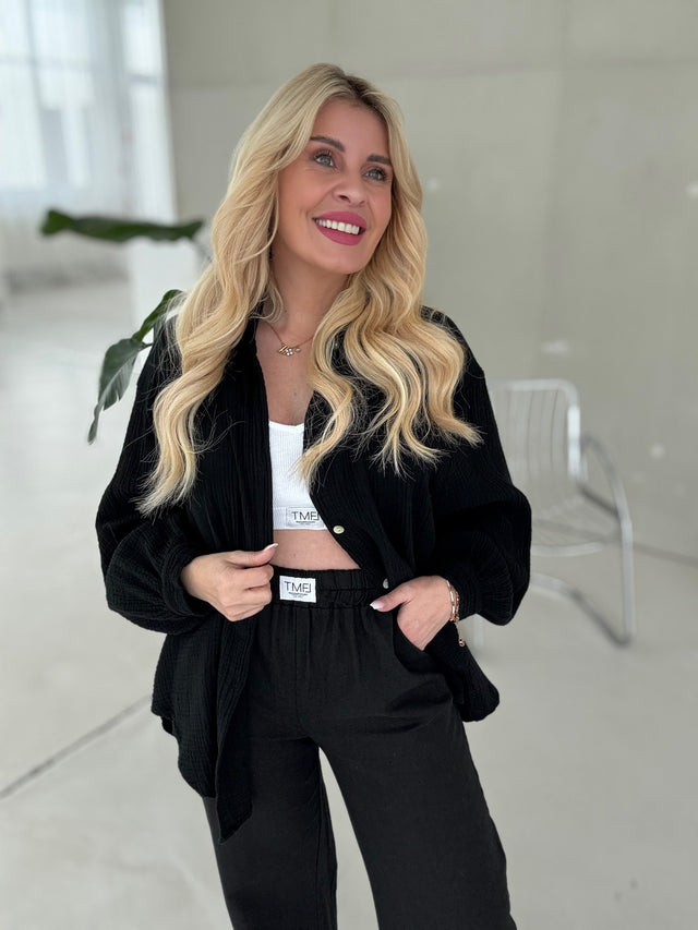 Signature Musselin Bluse mit Schleifchen Cropped SCHWARZ