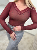 Stretchy Cashmere Langarmshirt black Hearts Burgundy mit Spitze